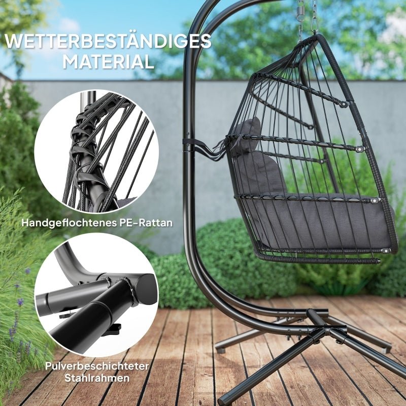 Hängesessel mit Gestell faltbar Hängekorb mit Kissen, Polyrattan, für 2 Personen, belastbar bis 260kg Sessel für Balkon Terrasse, Dunkelgrau